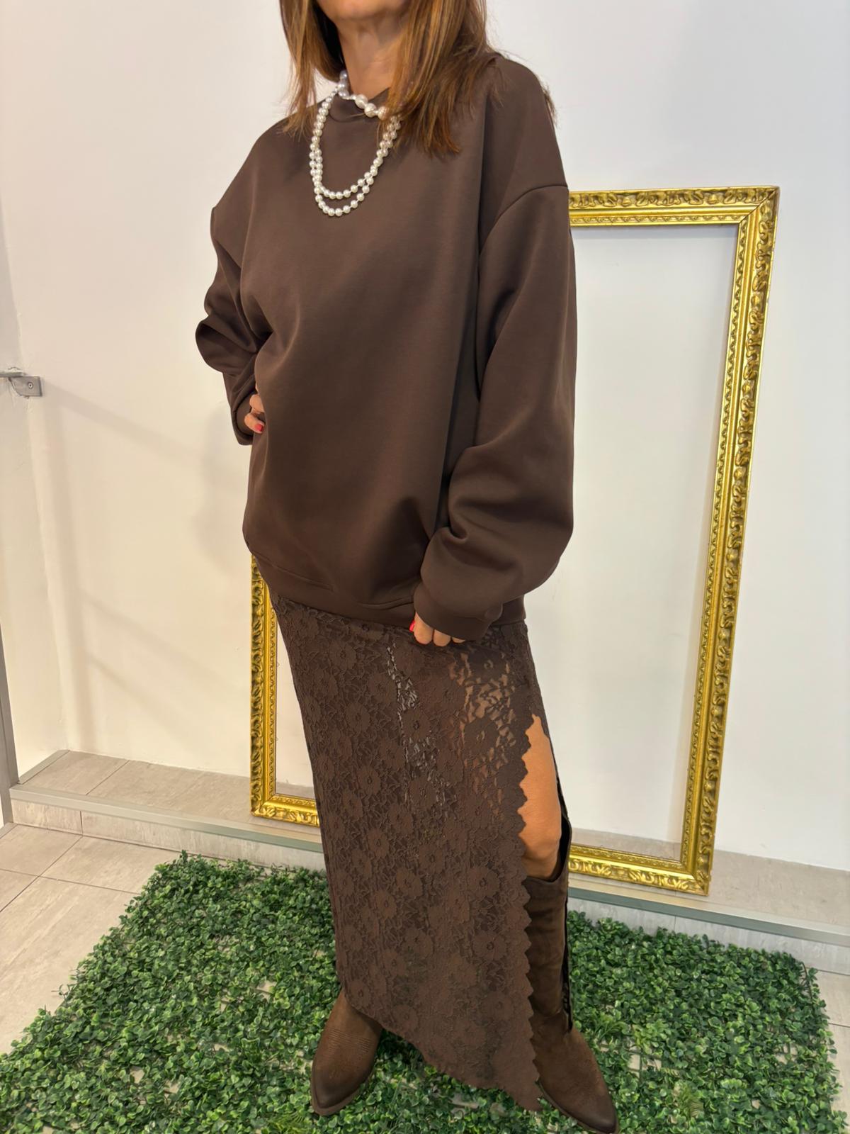Abito staccabile invernale da donna di Souvenir, colore marrone. La felpa è in cotone morbido, mentre l’abito in pizzo è realizzato in elastan per una vestibilità aderente econfortevole. Dettagli eleganti, combinazione versatile tra casual e sofisticato: felpa calda per i giorni freddi, abito in pizzo scuro per occasioni speciali. Un capo pratico e femminile, ideale per outfit a strati.