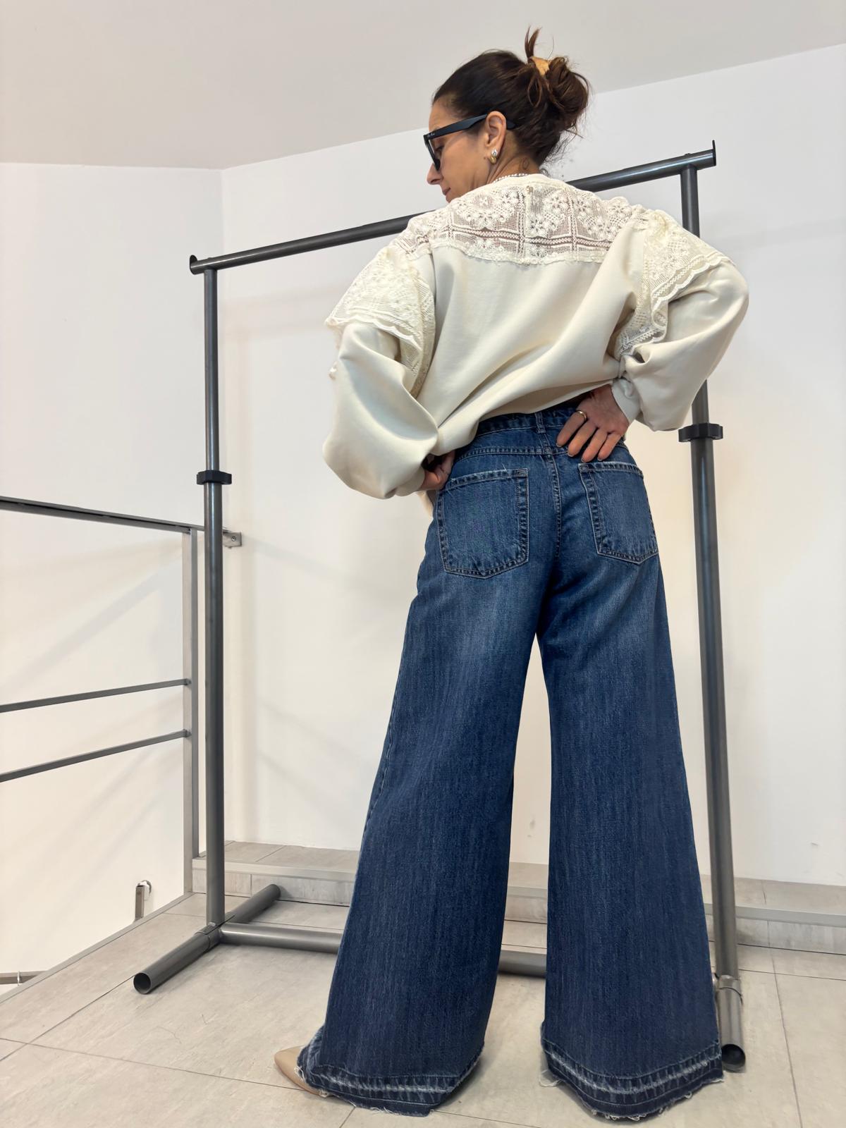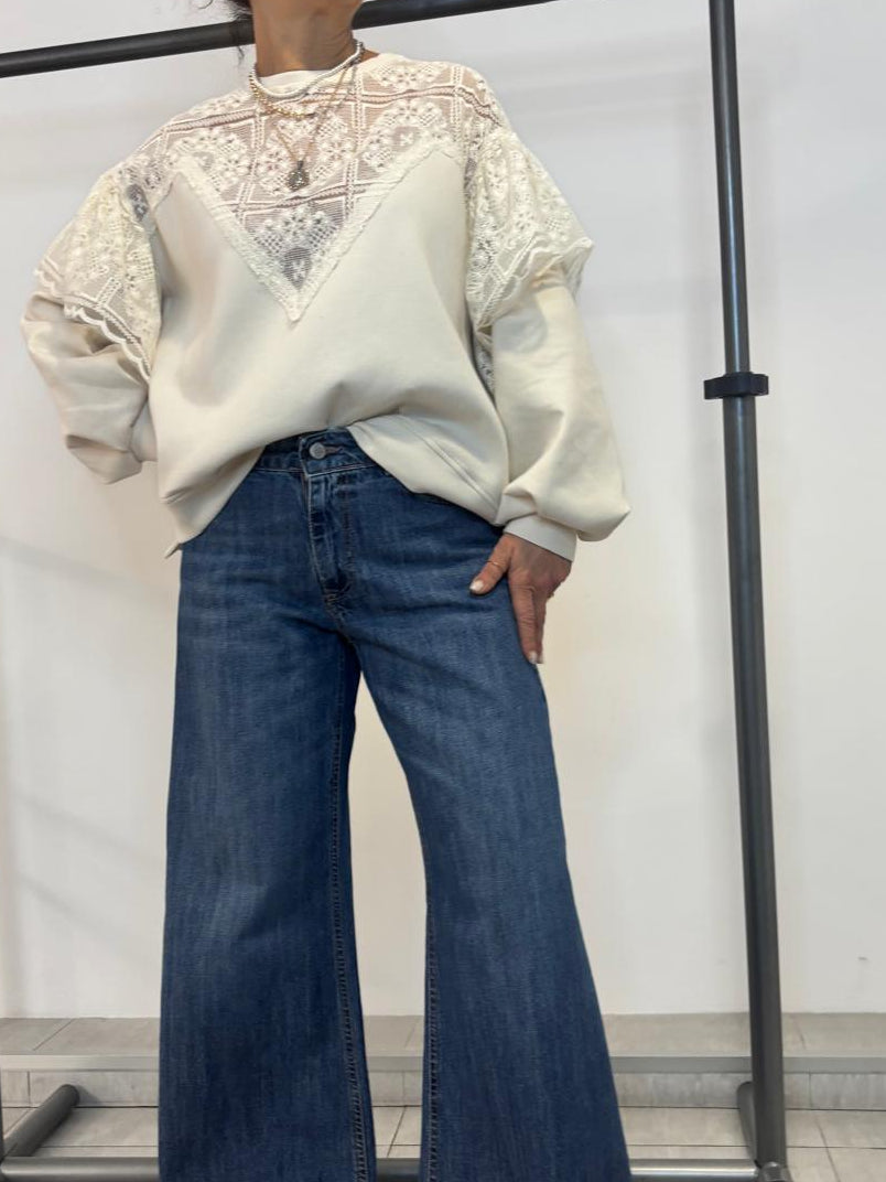Elegante felpa Philia Loft in morbido cotone 80%, perfetta per la stagione Primavera/Estate 2026. Questa felpa color panna si distingue per i raffinati dettagli in pizzo che impreziosiscono le spalle e il collo, creando un equilibrio perfetto tra comfort e stile sofisticato.
