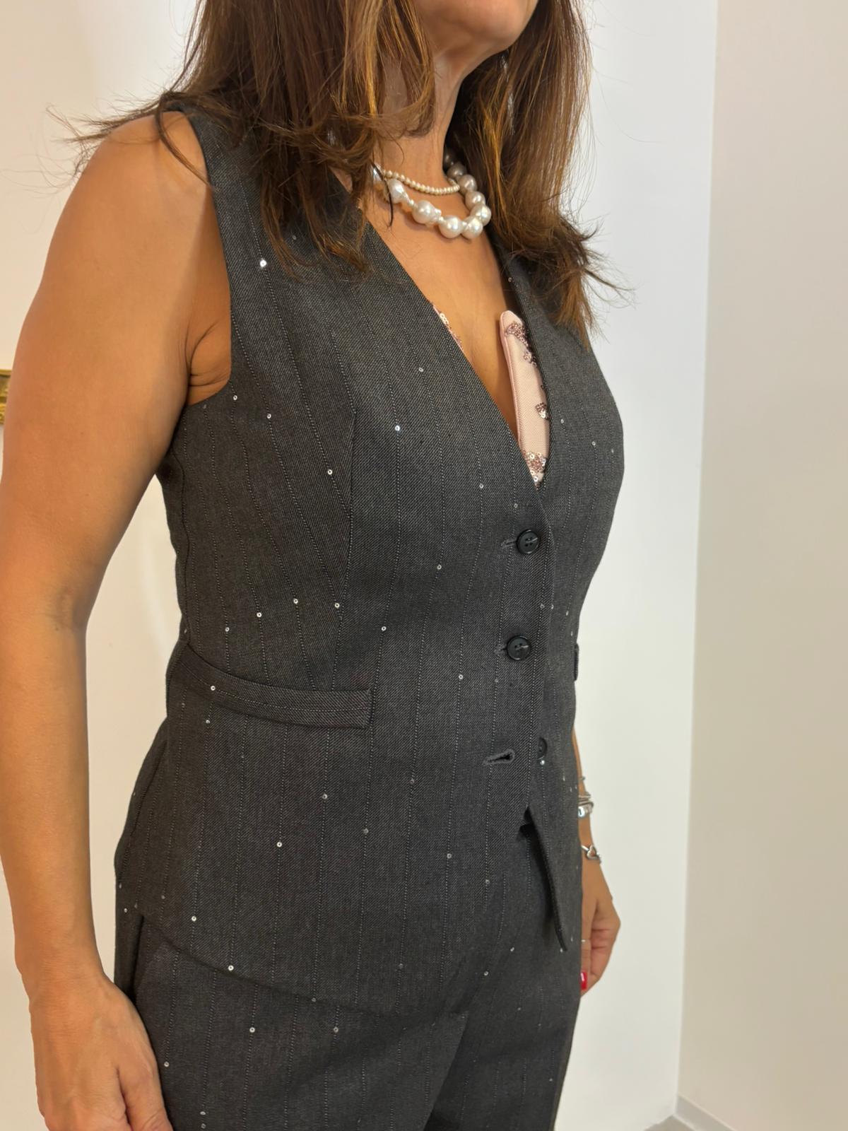 Gilet grigio con paillettes del brand Please, appartenente alla collezione Autunno/Inverno 25-26. Realizzato con finitura lucida e dettagli scintillanti, il taglio leggermente sartoriale offre una silhouette femminile pur rimanendo comodo da indossare. Le paillettes riflettenti aggiungono un tocco di glamour, perfetto per outfit da sera o per dare un tocco di luminosità a look quotidiani. Rifinito internamente per comfort, con chiusura a girello/zip e taschine nascoste per praticità. Realizzato in tessuto misto poliestere, viscosa (33%) ed elastan.