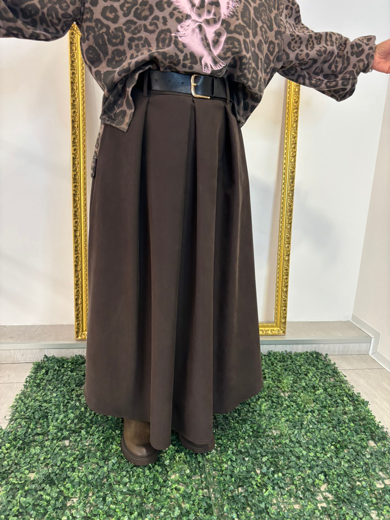 Gonna lunga con cintura, colore moro, brand Susy Mix. Realizzata in 65% viscosa e poliestere per una caduta morbida e una piacevole resistenza. Taglio elegante e cintura valorizzante, perfetta per outfit raffinati e femminili.